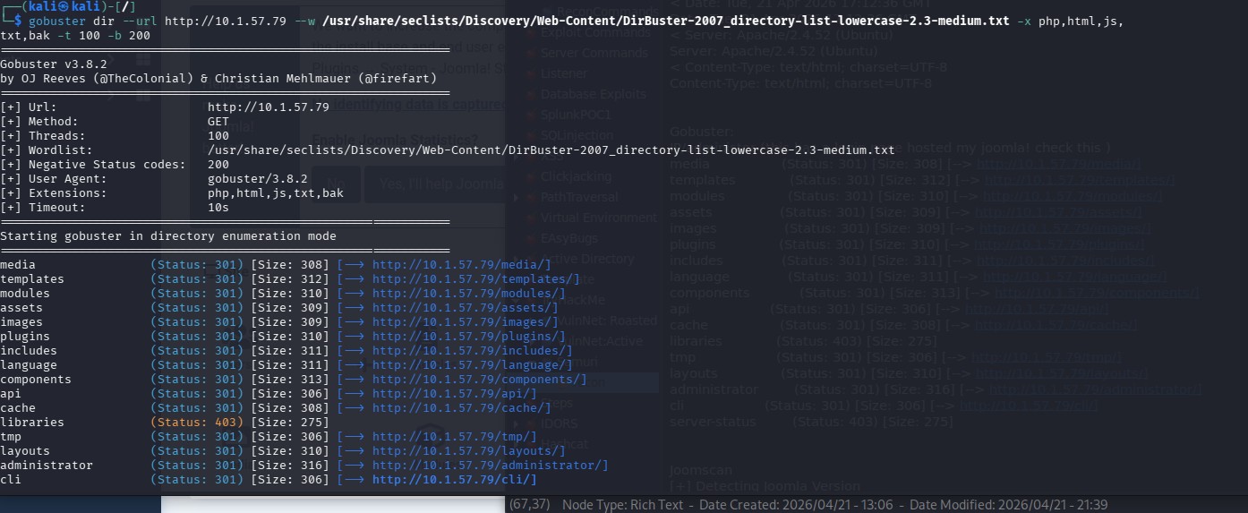 gobuster dir --url http://10.1.57.79 --w /usr/share/seclists/Discovery/Web-Content/DirBuster-2007_directory-list-lowercase-2.3-medium.txt -x php,html,js,txt,bak -t 100 -b 200
